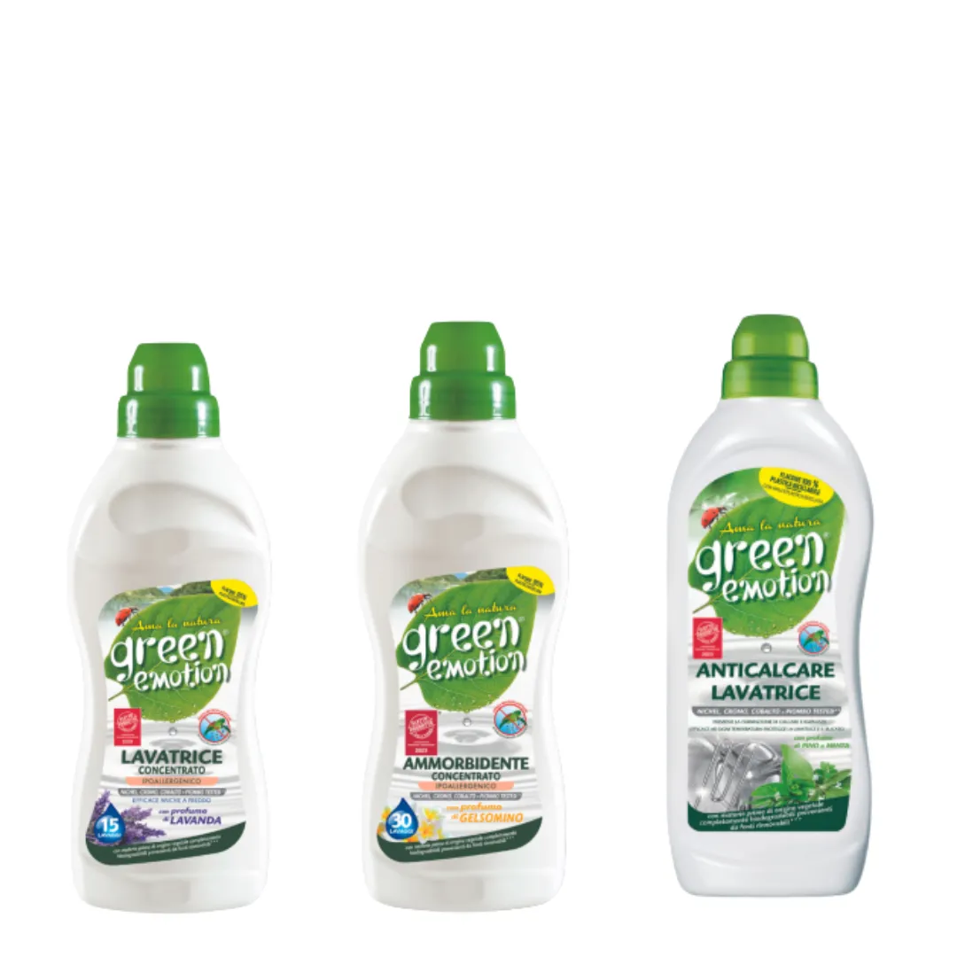 • Ekologiškas skalbimo mašinų valiklis GREEN EMOTION 750 ml. Šis valiklis, pagamintas iš natūralių ingredientų, efektyviai valo skalbimo mašinas nuo kalkių ir kitų nuosėdų. Jis padeda išvengti nemalonių kvapų ir prailgina mašinos tarnavimo laiką. Hipoalergiškas, su mažu alergenų kiekiu, be fosforo ir dažiklių. Pakuotė yra visiškai perdirbama. Laikyti sausoje, gerai vėdinamoje vietoje ir vaikams nepasiekiamoje aplinkoje.